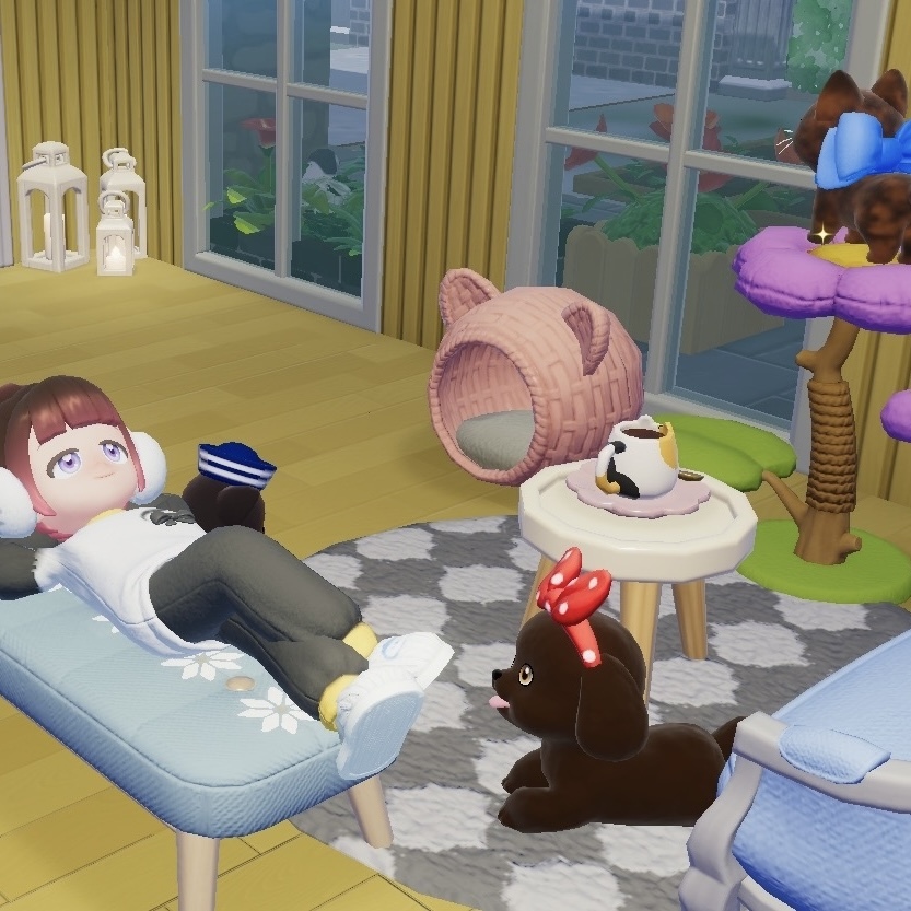 1階を全部スケートリンクにしたら、ワンコとニャンコが家の中に入らなくなってしまって寂しかったので土地を拡大してみんなで過ごす部屋をつくった。集まってきてくれて嬉しい。